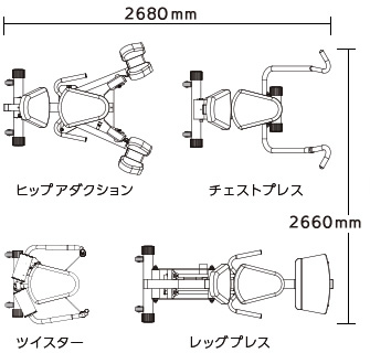 下半身トレーニングマシンのヒップアダクションやレッグプレス、体幹を鍛えるツイスターなどと組み合わせて【痩身トレーニングシステム】として導入・設置いただく場合の設置スペース占有イメージです。