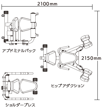 上半身を鍛えるショルダープレス、体幹を鍛えるアブドミナルバック組み合わせて【基本トレーニングシステム】として導入・設置いただく場合の設置スペース占有イメージです。