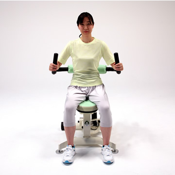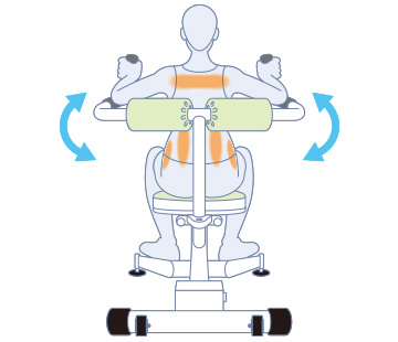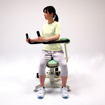 両手でアーム部分を握り、左右に最後までねじり、元の位置に戻し、続いて反対側にねじってリハビリ・トレーニングします。